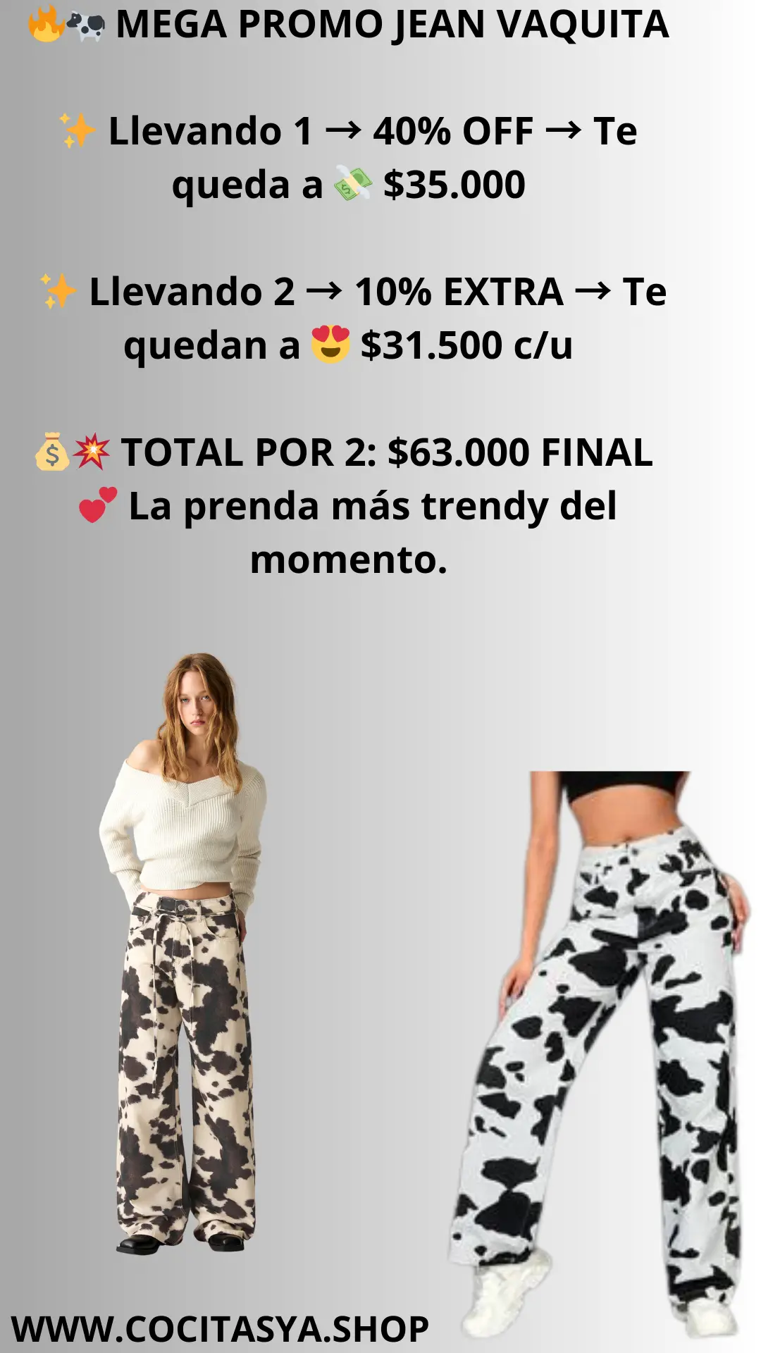 l jean que no puede faltar en tu placard. El vaquita llegó para romperla: estampado súper trendy, calce cómodo que se adapta a vos y una tela que acompaña todos tus movimientos. Es canchero, distinto y levanta cualquier outfit sin esfuerzo. Ponételo y modo fashion ON. 🐄✨