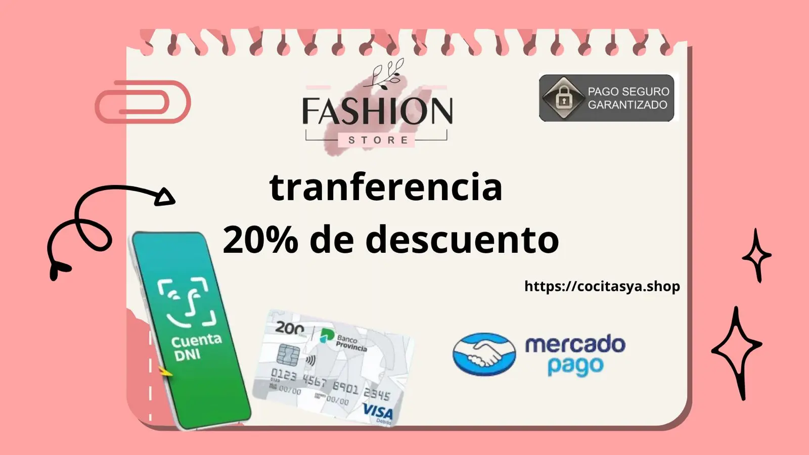 💸✨ En Fashion Storee queremos que disfrutes de los mejores precios sin renunciar a la calidad. Por eso, cuando elegís pagar por transferencia bancaria, accedés automáticamente a un 20% de descuento exclusivo en tu compra.